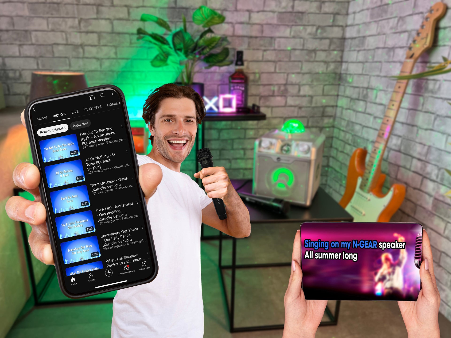 N-GEAR Disco Star 710 Party time or time to relax? With the Disco Star 710, you can do both. This 7-in-1 party speaker features powerful sound, an LED light show, and a star projector. Now with two microphones for karaoke fun! For Every Mood DISCO MODE – Full light show RELAX MODE – Calm and ambiance FOCUS MODE – Light only SPORT MODE – Pumped-up music MIX MODE – Pair two speakers Always Connected Bluetooth 4.2 USB AUX Micro SD Powerful & Portable With 50 watts of power, deep bass, and 6 hours of playtime, you can take it anywhere. Recharge via USB-C. The remote gives you full control over lights, sound, and modes. What’s in the Box Speaker 2 microphones AUX + USB-C cable Remote control N-GEAR MAKES YOU MOVE!