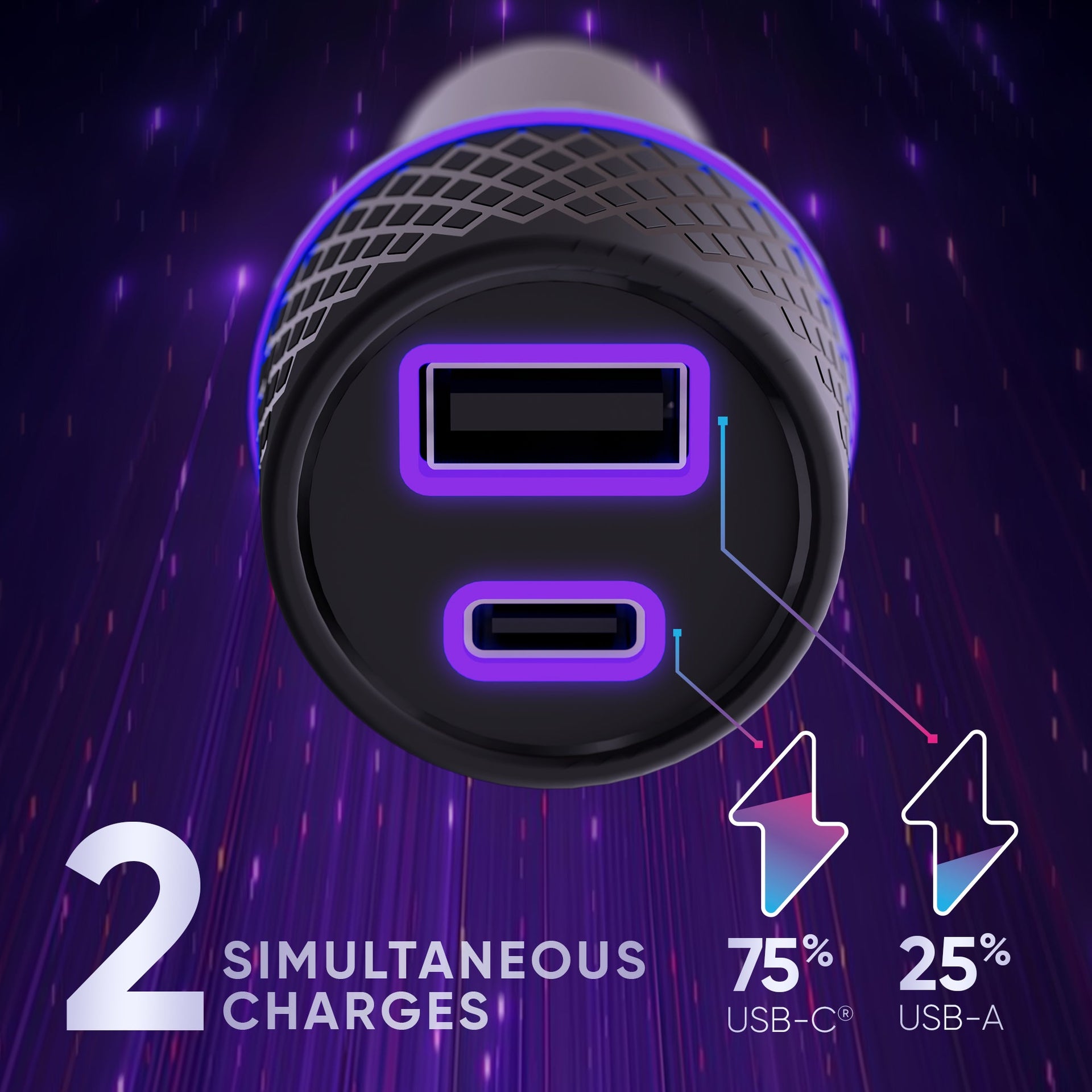 This car charger is perfect to charge devices during long trips. Its 60W power supply charges all kinds of devices like the Switch™ 2 or laptops very quickly. Thanks to its USB-A and USB-C® ports you can charge devices old and new and up to 2 devices at the same time. The 1.5 meter cable stretches to the back of the car so that you can still use your devices while charging them. Its purple LED outlines will ease your life during nighttime travels.