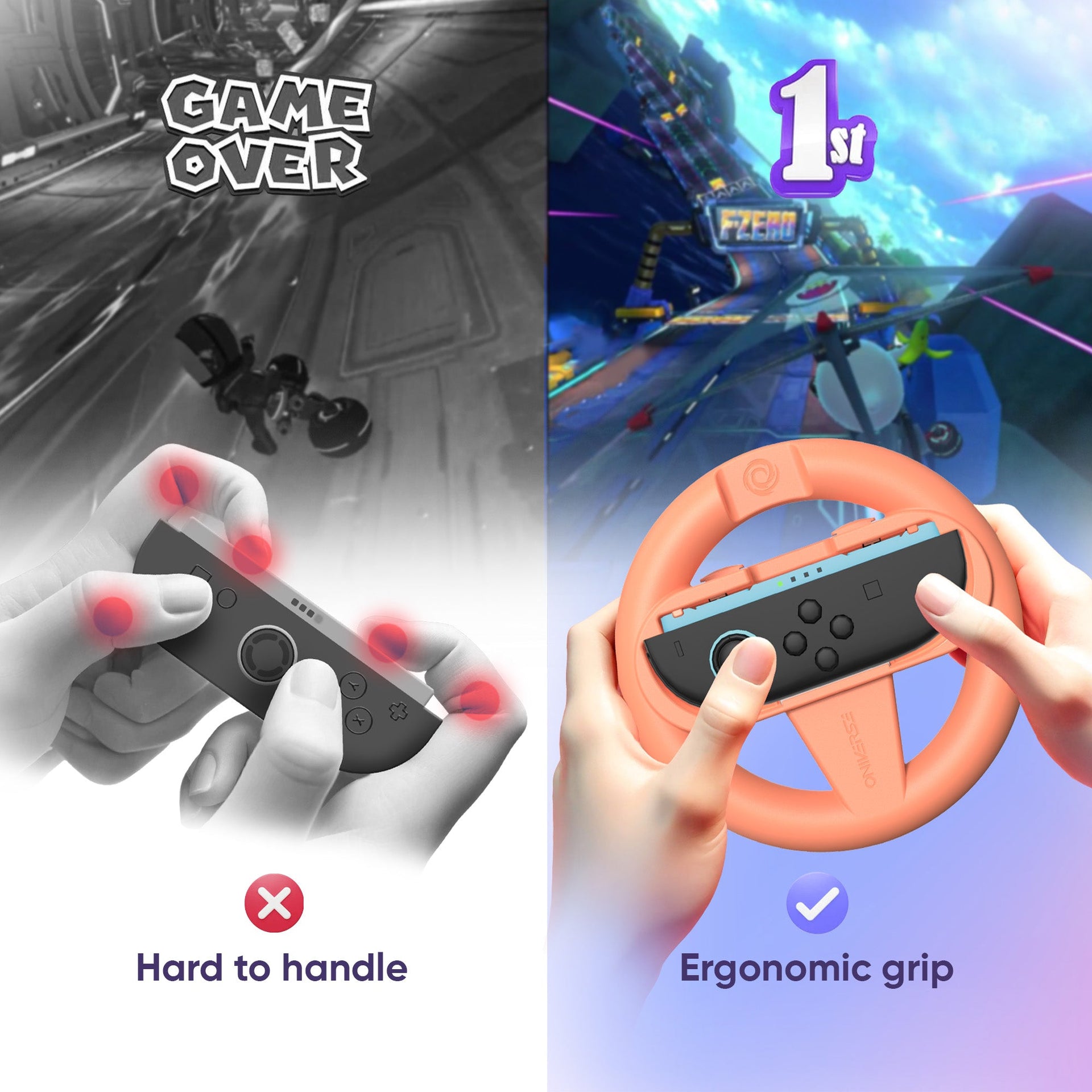 4-in-1 pack consisting of 4 racing wheels for Nintendo SwitchTM controllers. The wheels provide an optimal gaming experience and successful immersion! 4 colors included in the same pack: Blue, Orange, Purple, Green.