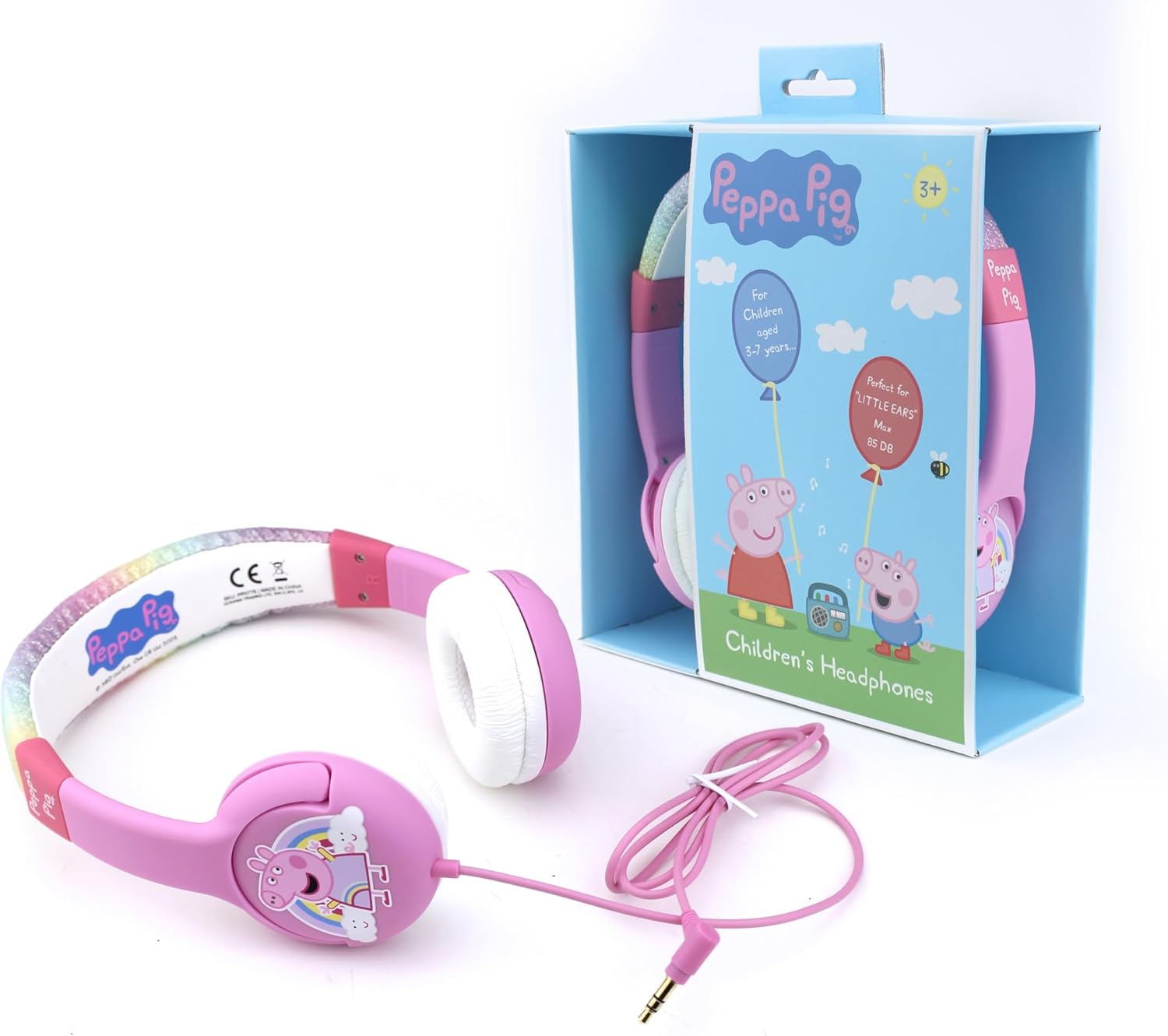 Perfectly pink and rainbow glitter, these Peppa Pig kids headphones are going to brighten your little one's day! These headphones feature your little one's favourite character Peppa Pig with beautiful rainbow and padded rainbow glitter headband, Your little star will be ready for a day full of fun in this headphones! it's perfect for homeschooling, listen to music or movie and playing game using 3.5mm universal stereo jack. These children’s headphones are designed for listening to music, watching movies and playing games, these headphones have been restricted to 85 dB and have been tested/passed as suitable for children aged between 3 - 7 years. These headphones can be used with all your favourite devices using a 3.5mm universal jack connector. (i.e. use with iPads, iPods, Tablet, handheld games, learning devices, portable DVD players, 2Ds XL and Nintendo switch). Features adjustable padded headband with soft touch ear pads for comfort.